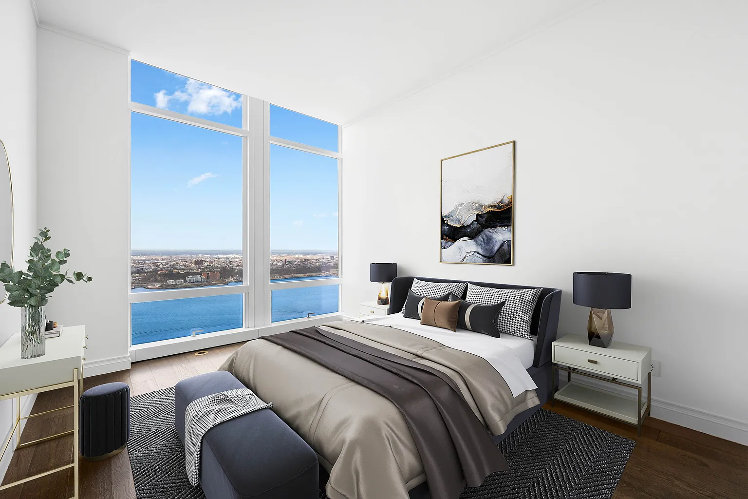 Available for rent immediately. Live in this expertly planned 2570sqft 3-bed, 3.5 bath Residence 6201 boasts soaring 14-FT ceilings, lavish satin finish wide plank French oak floors, expansive entry gallery, sun-drenched corner Great Room, and stunning views of the Hudson River from every room. The windowed eat-in kitchen has been outfitted with luxurious Smallbone of Devizes cabinetry with opal white marble counters and backsplash.