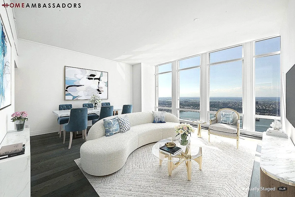 The BEST two bedroom in the building. EXPERIENCE SPECTACULAR VIEWS OF THE HUDSON RIVER FROM EVERY ROOM. This expertly planned corner two bedroom Residence 6902 an 11” ft ceilings, an expansive living room (22"9 × 21"5) lavish satin finish wide plank French oak floors, and stunning views of the Hudson River from every room. The stunning kitchen has been outfitted with luxurious Smallbone of Devizes cabinetry with opal white marble counters and backsplash.