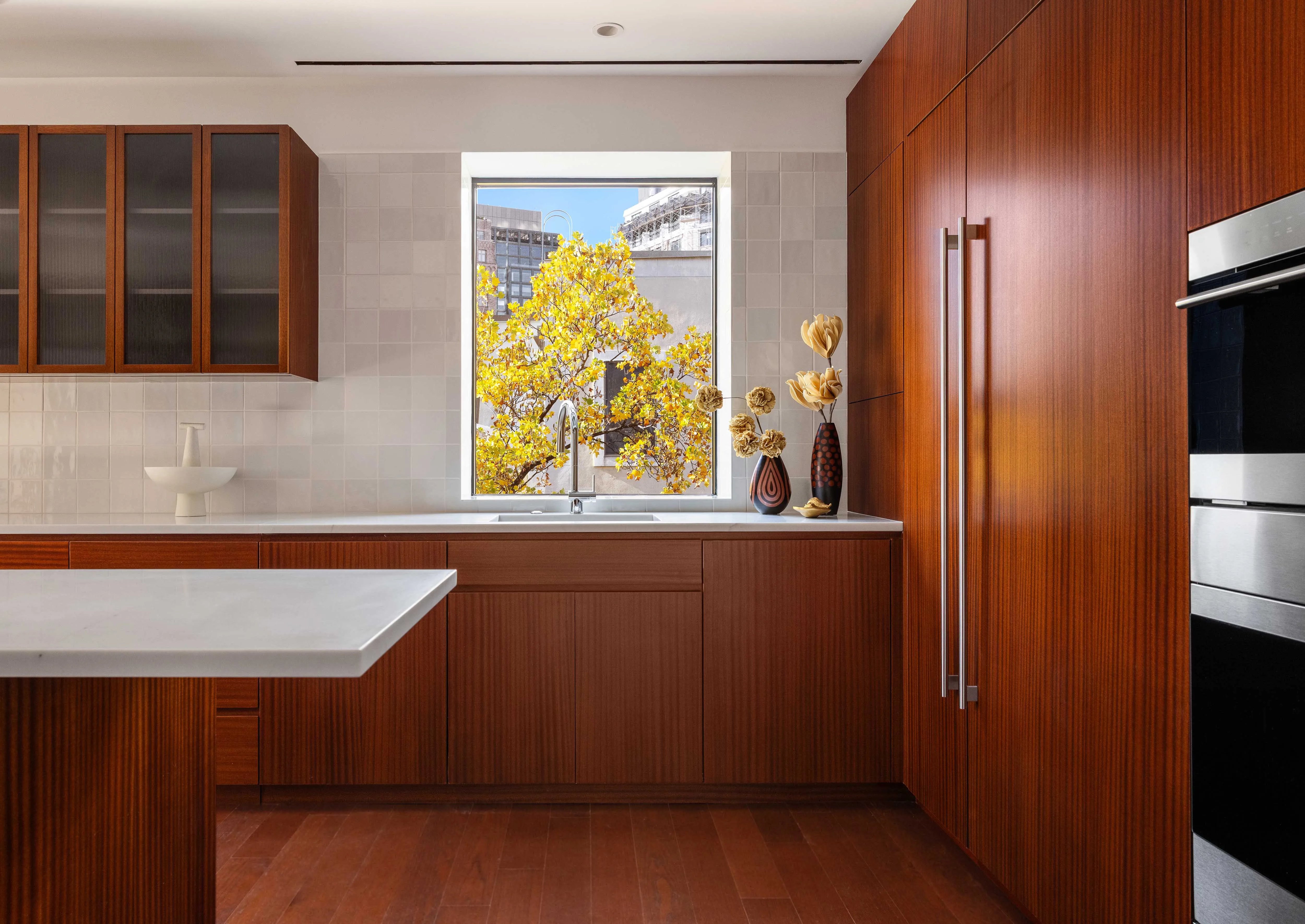 A double-sided gas fireplace separates the living room from the formal dinning room, and while these spaces were designed to welcome-in the views and natural light, they were also designed to include expansive wall plains to allow for installation of large format artwork or for displaying entire collections. The sunny eat-in kitchen is separate from the formal living and dining spaces, and includes a den for practical living. The spacious kitchen includes a center island, a suite of premium Gaggenau appliance, unique lavastone countertops, and an enormous amount of mahogany millwork cabinetry that would satisfy even the most avid crockery collector.