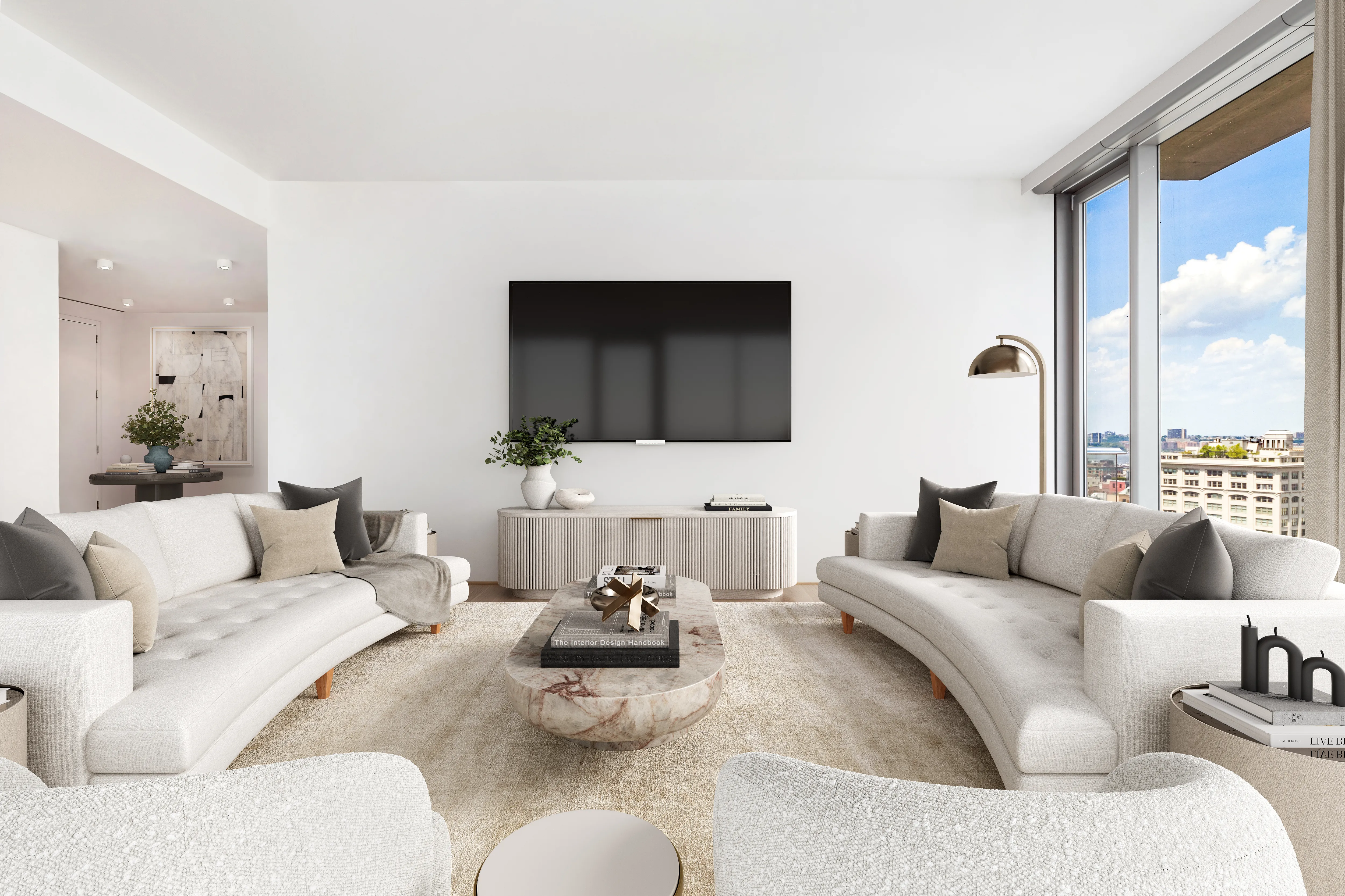 Fantastic room for entertaining - expansive living and dining. A chef’s eat-In show Kitchen with custom Miele appliances including refrigerated wine storage, warming drawer, and endless floor to ceiling mirrored cabinetry and a sliding granite island for additional storage and seating. A double exposure Primary Bedroom suite with East and open South views to enjoy the most romantic and iconic view of Manhattan from bed - centered and framed to the Freedom Tower and Financial District.