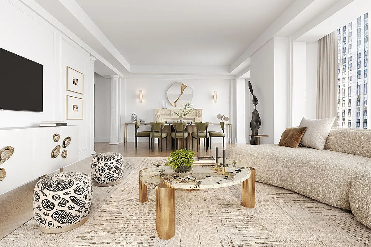 The expansive living and dining areas offer an elegant setting for both entertaining and everyday living, with Fifth Avenue views that bring the city’s energy directly into the home. A windowed, eat-in kitchen with top-tier appliances overlooks Sixth Avenue, while a richly wood-paneled library provides a refined workspace or private retreat. The primary suite features a dedicated dressing area and an en-suite marble bath. 641 5th Ave, developed by a consortium led by Aristotle Onassis, is a white-glove condominium offering a 24-hour multilingual staff, concierge, private fitness center, bicycle storage, and resident manager.