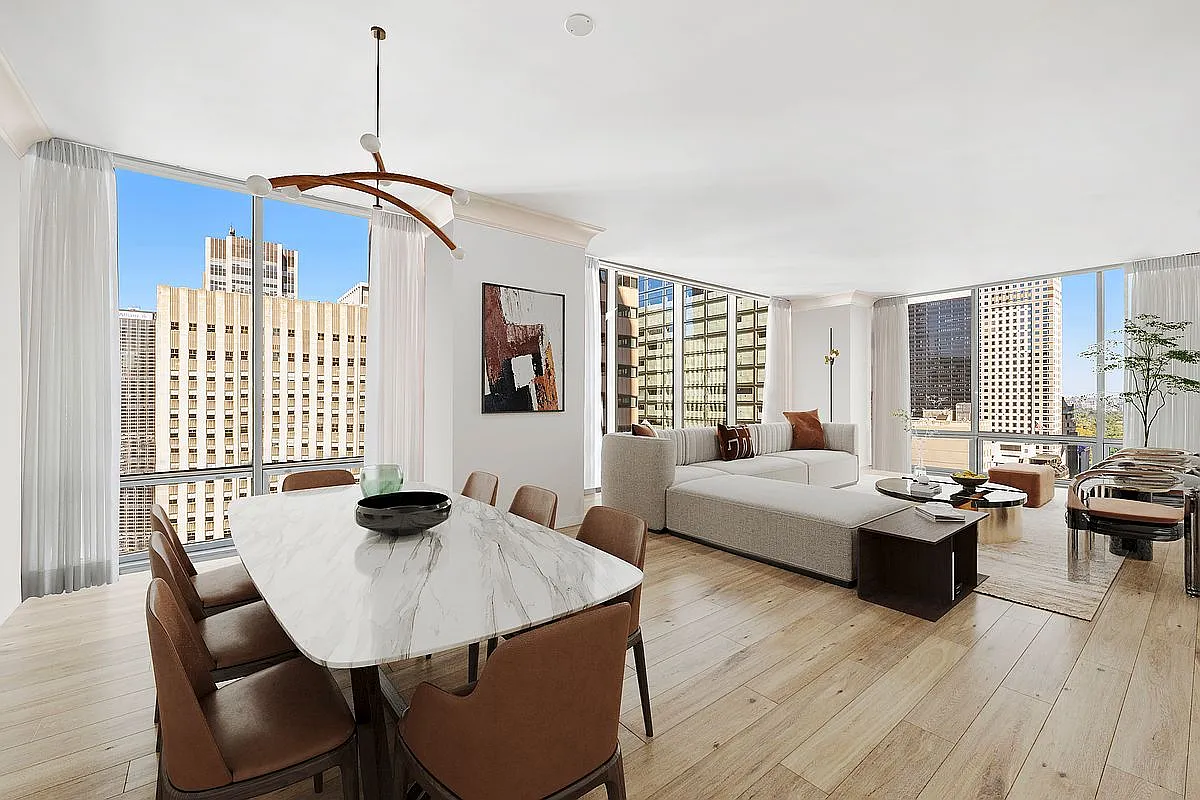 From sunrise to sunset, every room is bathed in radiant natural light. An elegant entry foyer opens to a grand corner living and dining room, ideal for entertaining or simply taking in the mesmerizing vistas high above Midtown. The large eat-in kitchen enjoys views of Radio City Music Hall and is complemented by a washer/dryer for convenience.