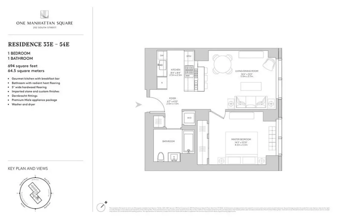 Available: starting 06/15/2026 This high floor Residence 42E imported stone and custom finishes, floor to ceiling windows, 5 wide stained oak flooring, in unit washer and dryer, a beautiful open gourmet kitchen with breakfast bar & premium Miele appliance package; it faces East and has spectacular iconic Manhattan and East River views. Master bathroom has custom wood cabinets, marble tile walls and mosaic floors with radiant heat, under-mount Wetstyle sink with glass vanity top and Dornbracht polished chrome faucets. 252 South St is an 80-story modern glass tower condominium located along the East River waterfront on the Lower East Side with unobstructed panoramic water and skyline views. Designed by Adamson Associates Architects the Toronto-based firm which served as executive architects on The Shard at London Bridge, the 823-foot tower is a striking addition to the Manhattan skyline.