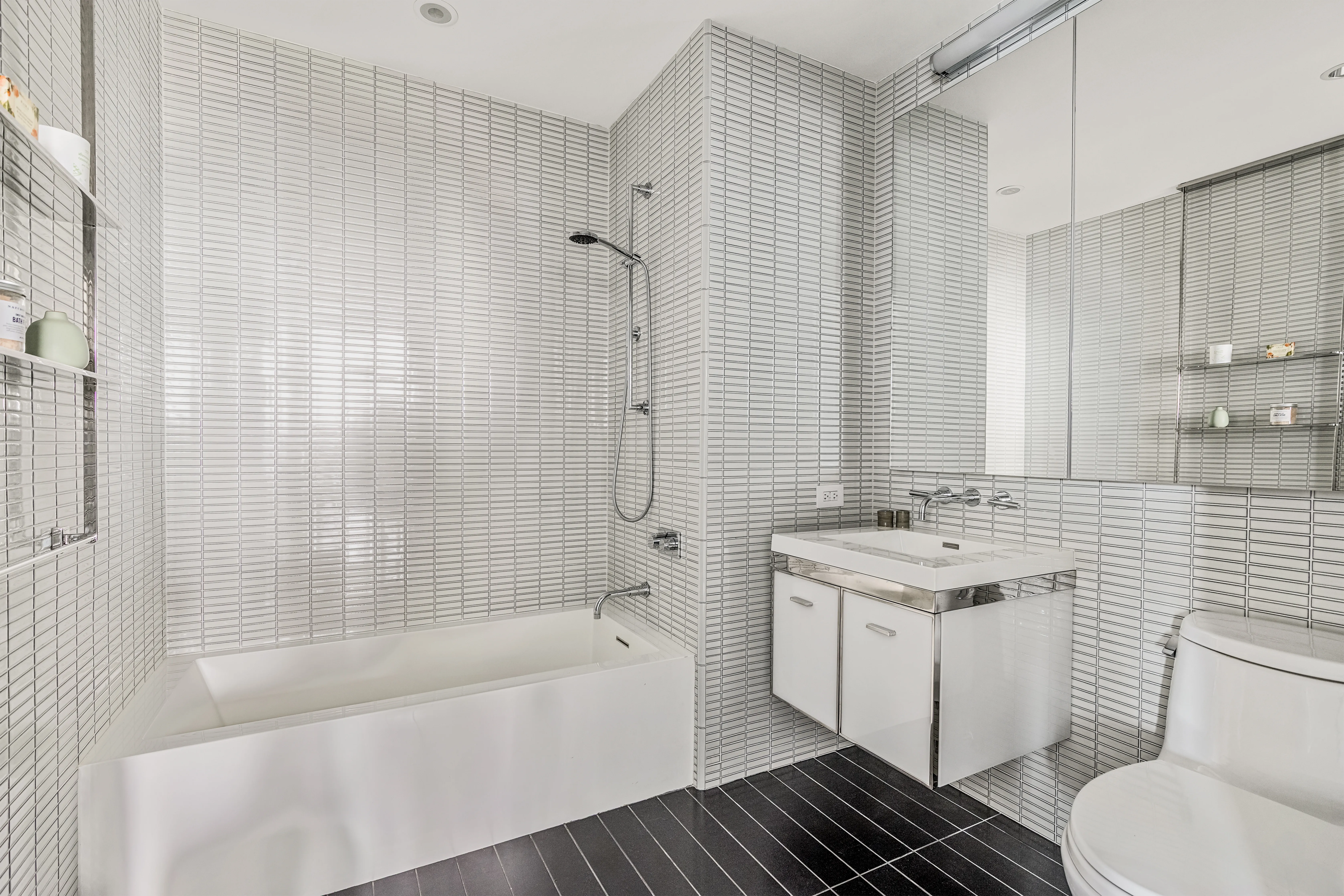 The open windowed chef’s kitchen overlooks the living room and boasts a breakfast bar, plentiful countertop and cabinet space, and the full premium Miele suite of appliances, including a microwave, wine cooler, and freezer with ice maker. The spacious primary bedroom enjoys a large closet and en suite bath with radiant heated floors, mosaic tiles, bespoke wood cabinetry, and Dornbracht polished chrome fixtures and faucet. Other hallmarks of this unique home include ebony stained oak hardwood floors, two-zone central A/C and heat, Bosch stackable washer/dryer units, app-controlled window shades in all rooms, and customized closet organizers throughout.