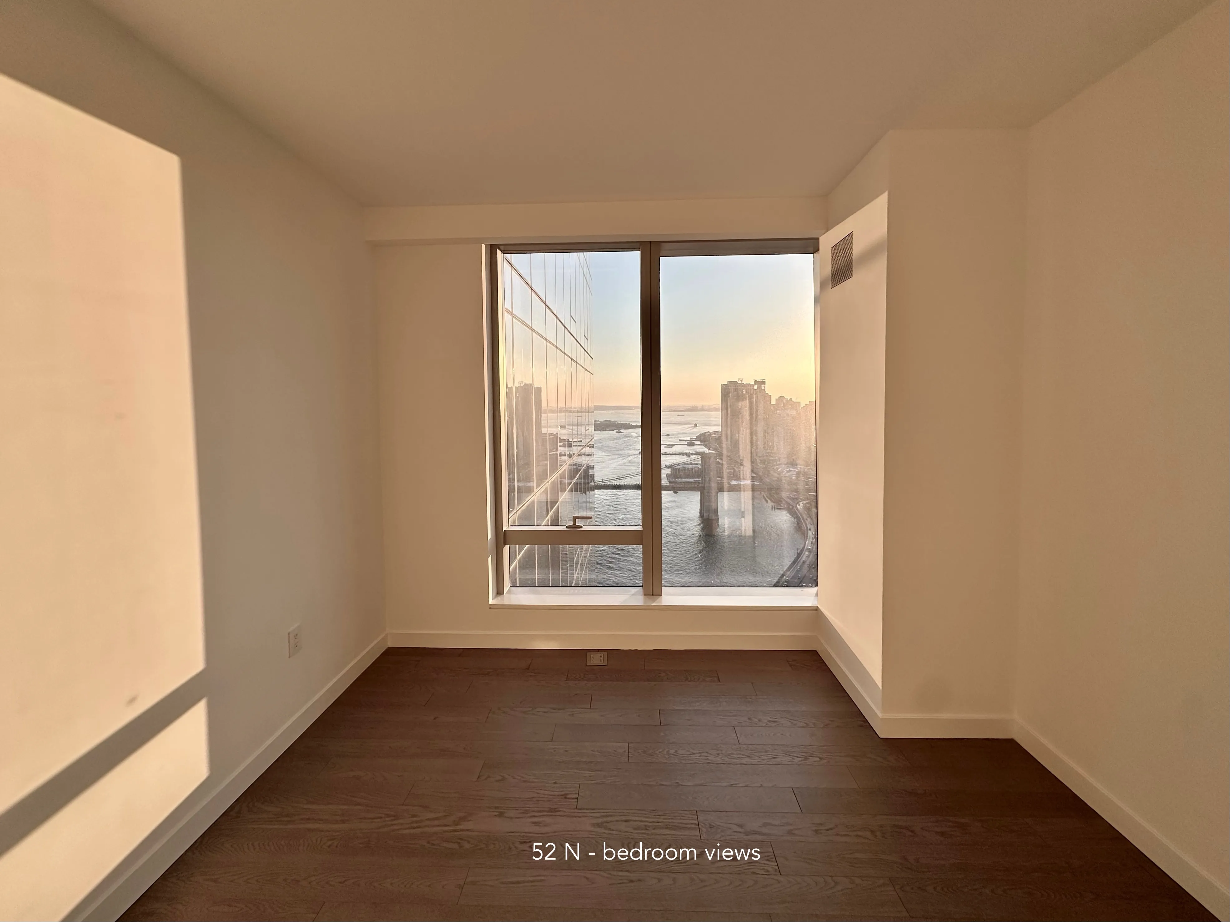 A bedroom with a skyline view. 52 stories above New York City. South facing windows. Central Air, A/C and heat.