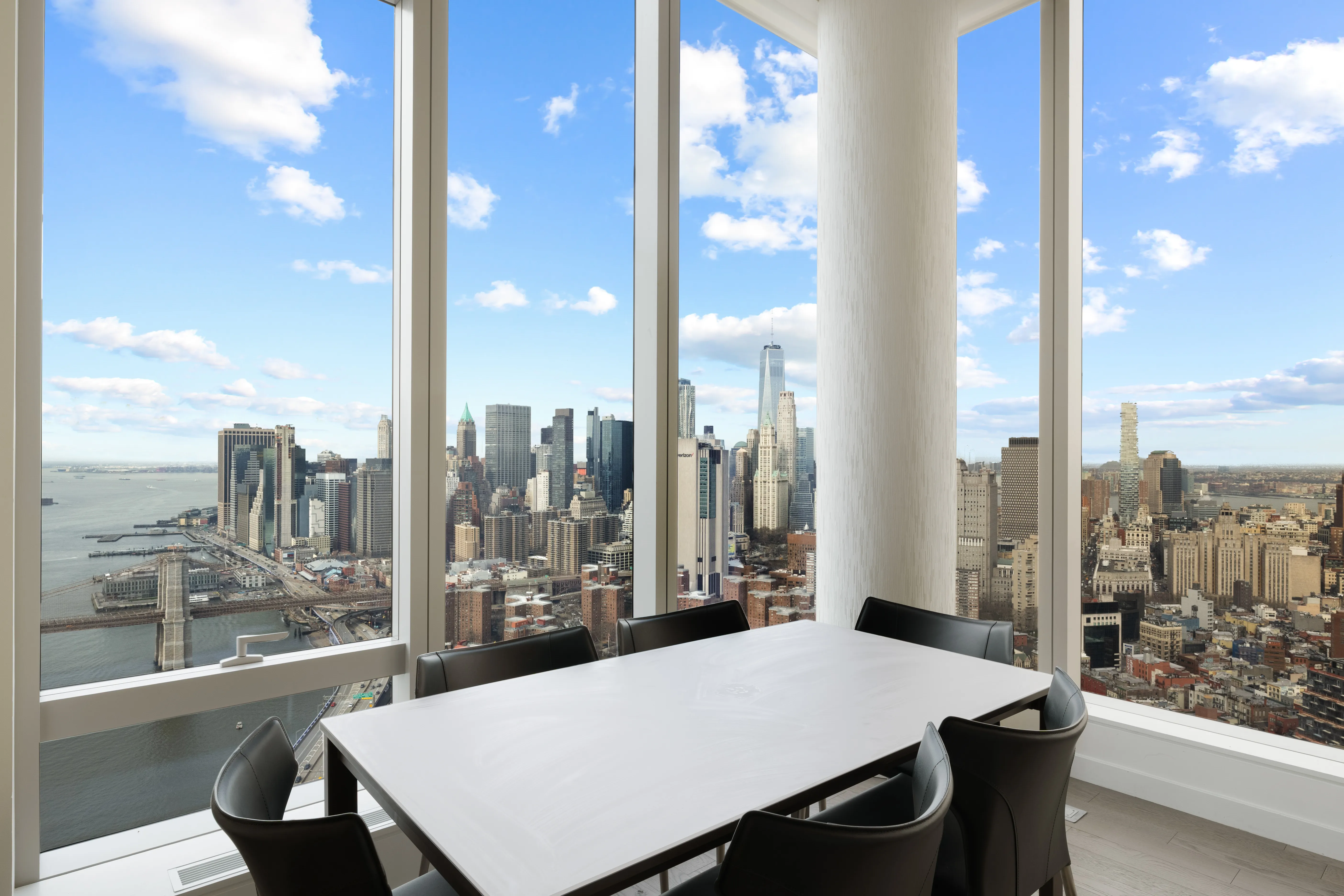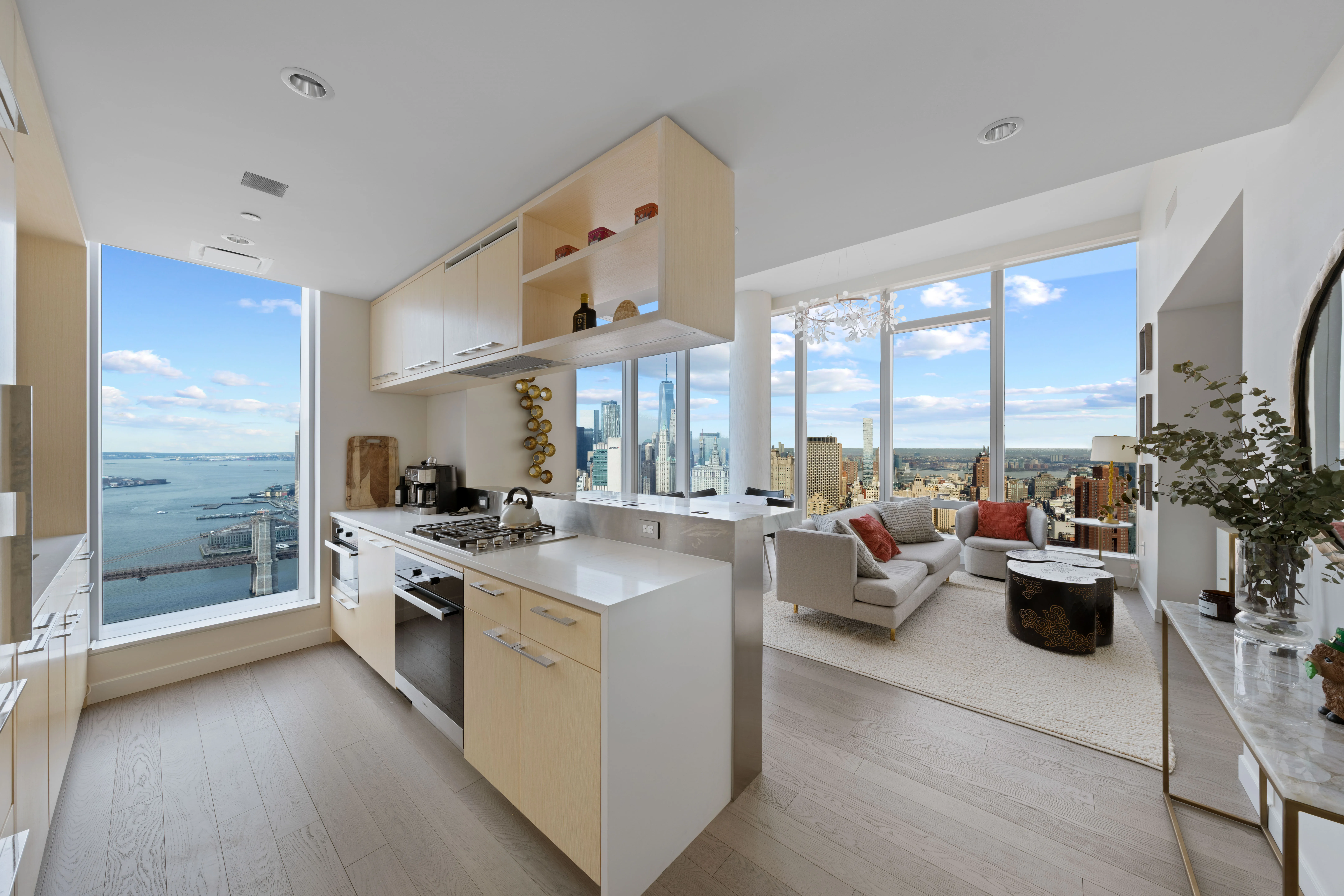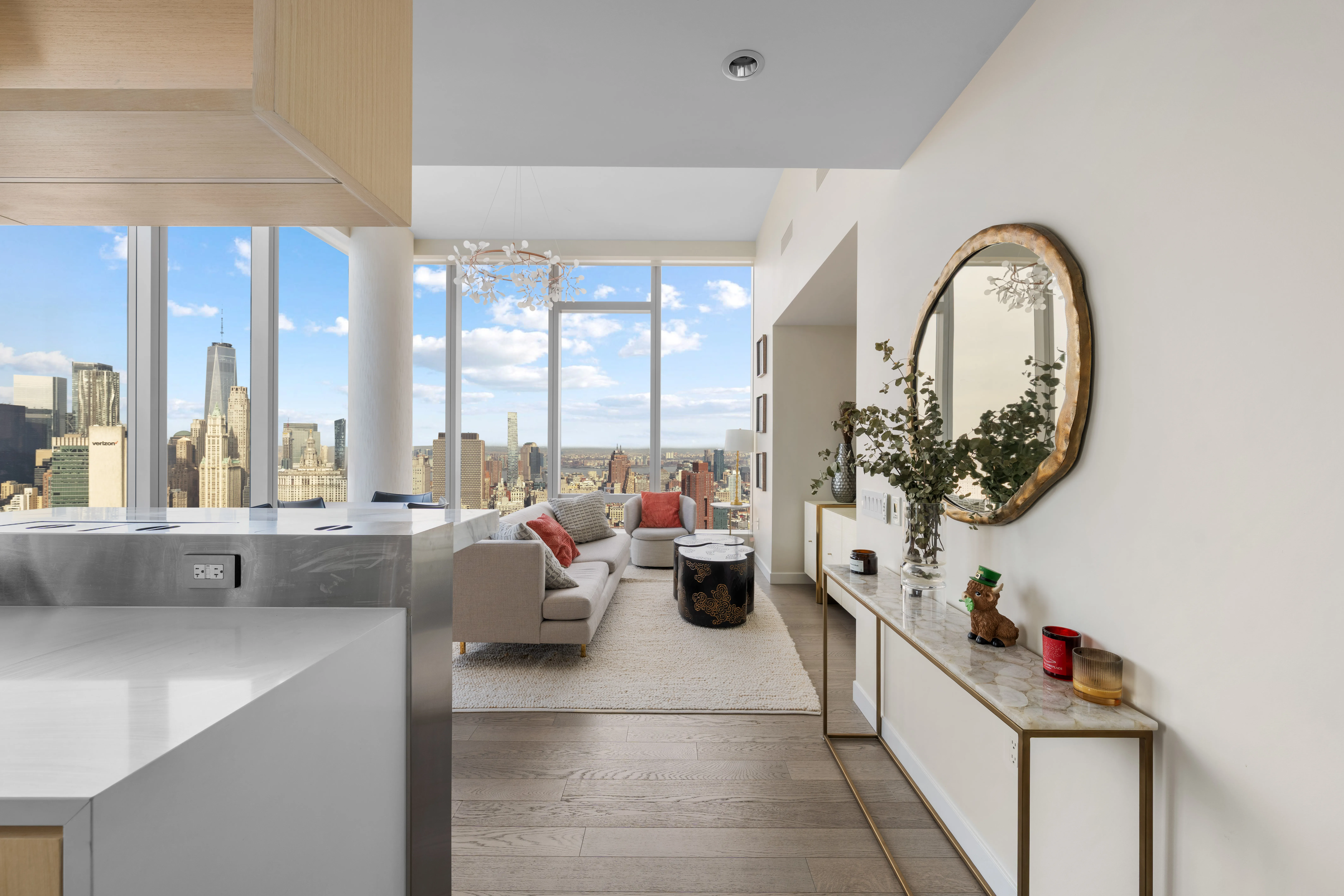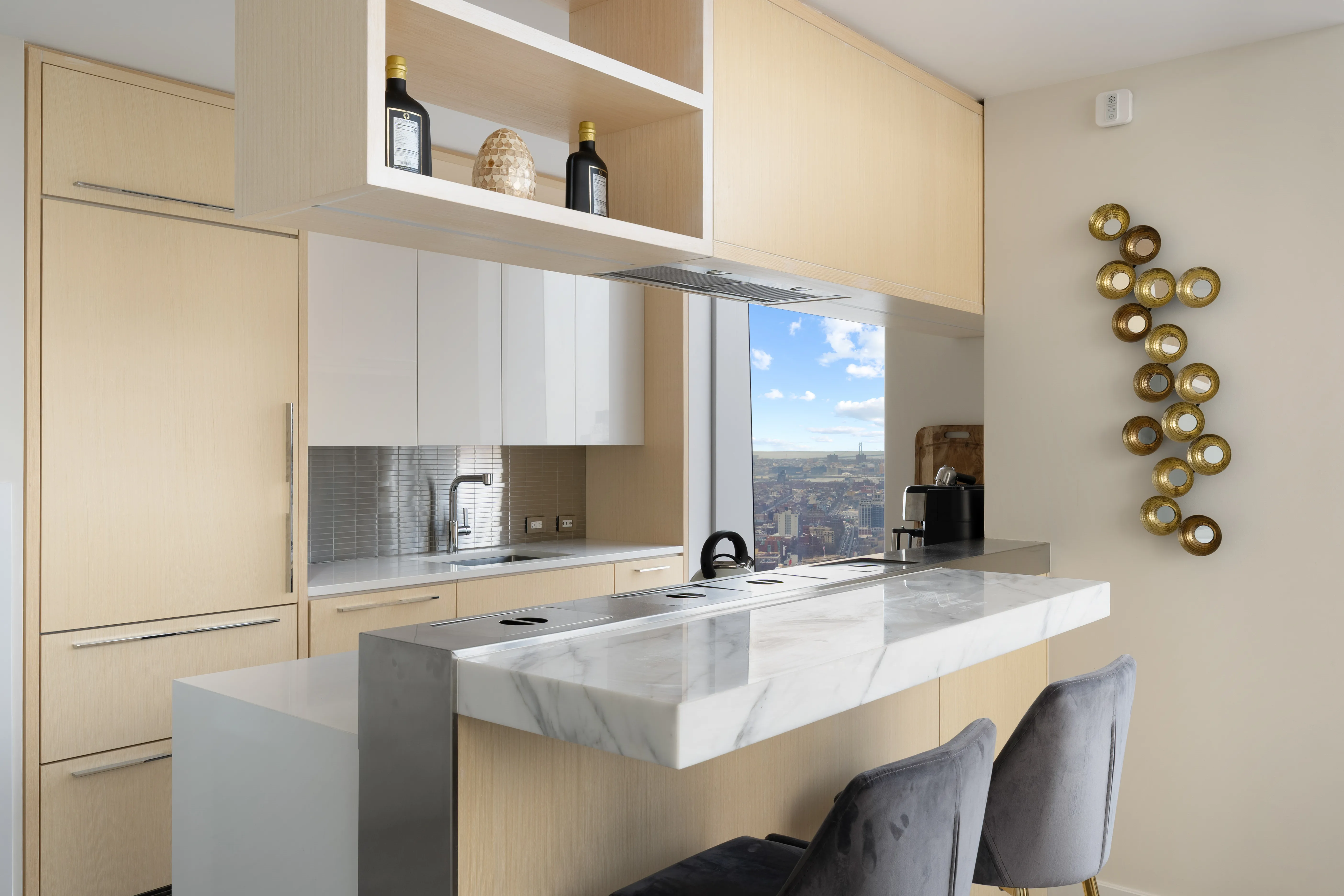 Two Bedroom, Two Bathroom Corner Unit – Fully Furnished – High Ceilings This bright corner Residence 54L stunning city and water views, with high-end finishes throughout including wide-plank oak flooring, imported stone, and a premium Miele appliance package. The spa-like primary bath features custom cabinetry, marble walls, heated mosaic floors, and sleek designer fixtures. An in-unit washer and dryer adds everyday convenience.