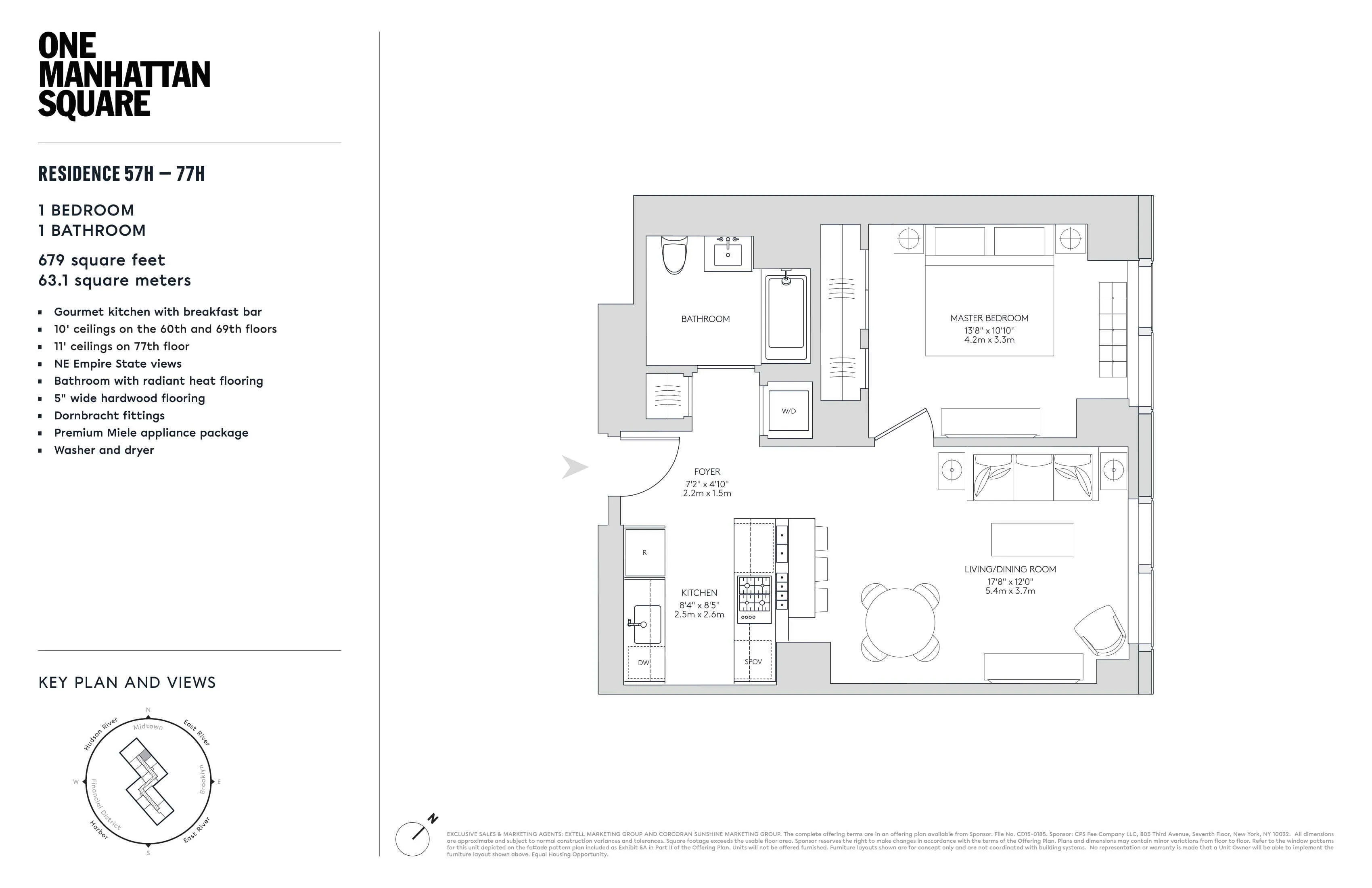 ONE MANHATTAN SQUARE OFFERS ONE OF THE LAST 20-YEAR TAX ABATEMENTS AVAILABLE IN NEW YORK CITY Residence 62H is a 679 square foot one bedroom, one bathroom with an open gourmet kitchen and breakfast bar and This spacious residence faces North East with East River and Williamsburg Bridge views. Warm, modern interiors are brought to life by the renowned design team at Meyer Davis Studio. This residence features imported stone and custom finishes, premium Miele appliance package, 5' wide stained oak flooring, master bath with custom wood cabinetry, marble tile walls and mosaic floors with radiant heat, under-mount Wetstyle sink with glass vanity top and Dornbracht polished chrome faucets and a washer and dryer.