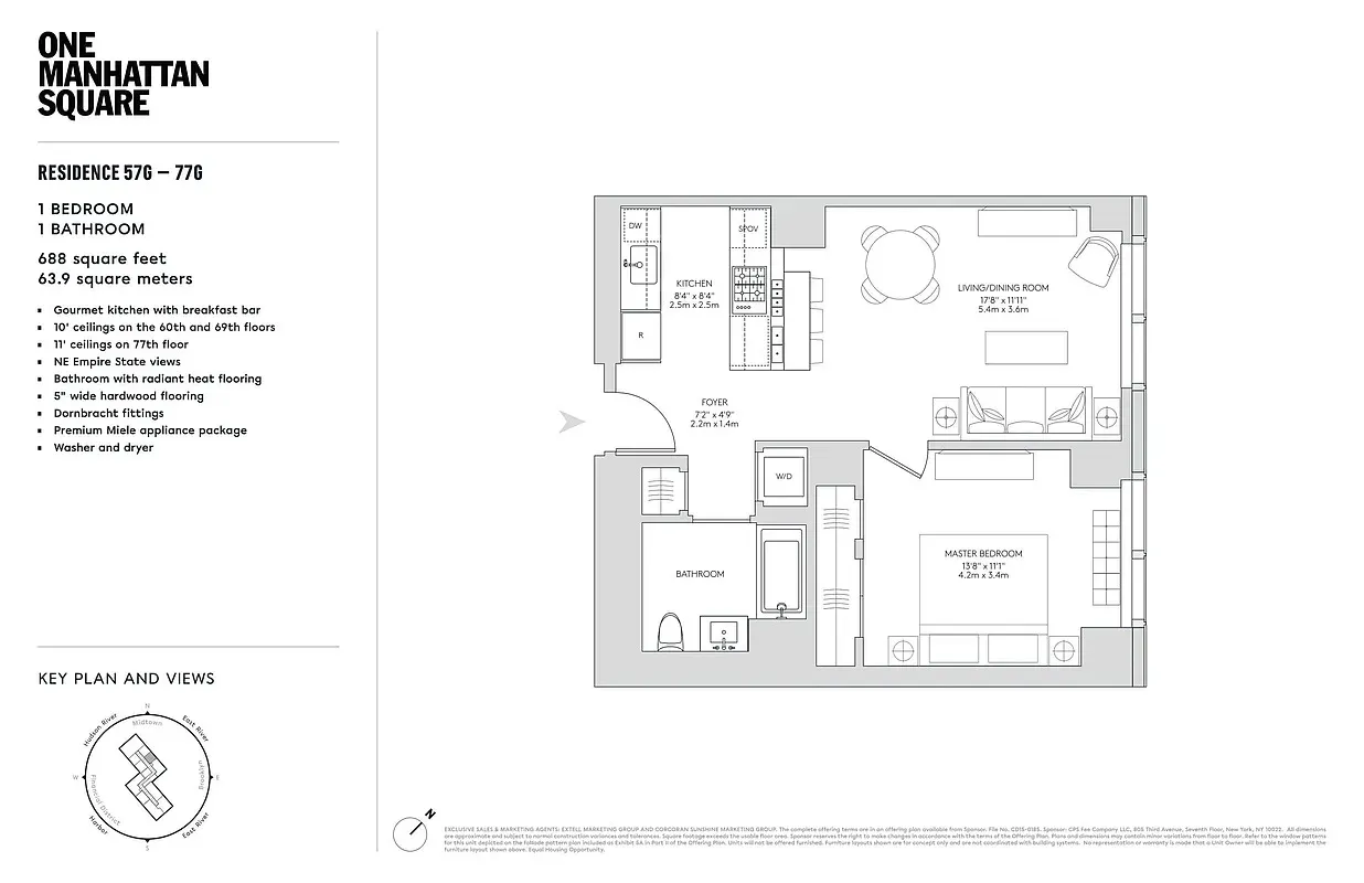 **64th-Floor 1-Bedroom at 252 South St – Highest One-Bed with Midtown Skyline Views** A rare opportunity to own one of the highest one-bedroom currently available at 252 South St with open, unobstructed views. Located on the 64th floor, this Residence 64G sweeping views of Manhattan’s skyline and the Empire State Building, along with the East River and Brooklyn. From morning light to evening city lights, the views create an inspiring backdrop visible from both the living area and the bedroom.