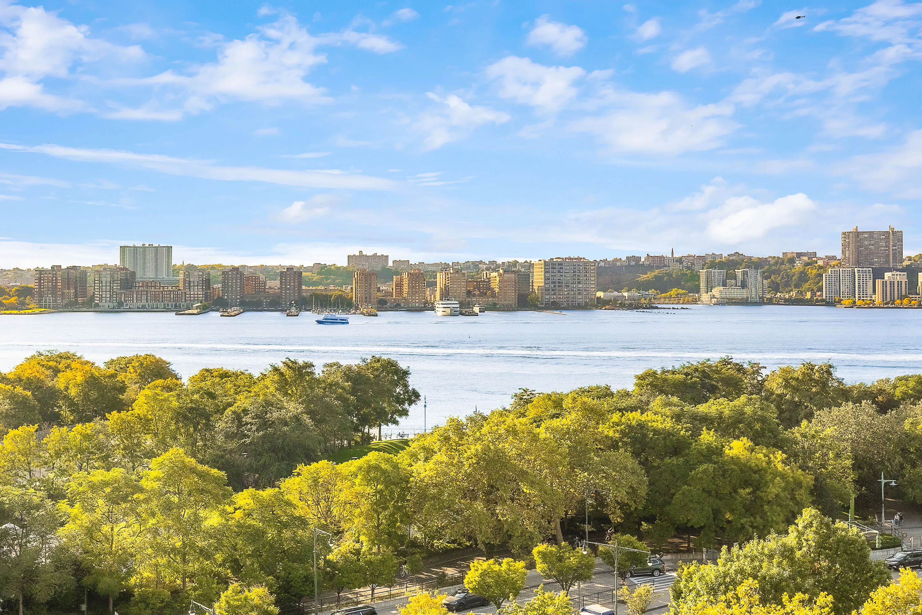 Additional apartment features include hardwood floors, a vented washer/dryer, and smart Wi-Fi Nest thermostats. The west-facing primary suite offers Hudson River views and two closets. The en-suite bathroom is finished in marble and includes a double vanity, soaking tub, separate glass-enclosed shower, and radiant heated floors.