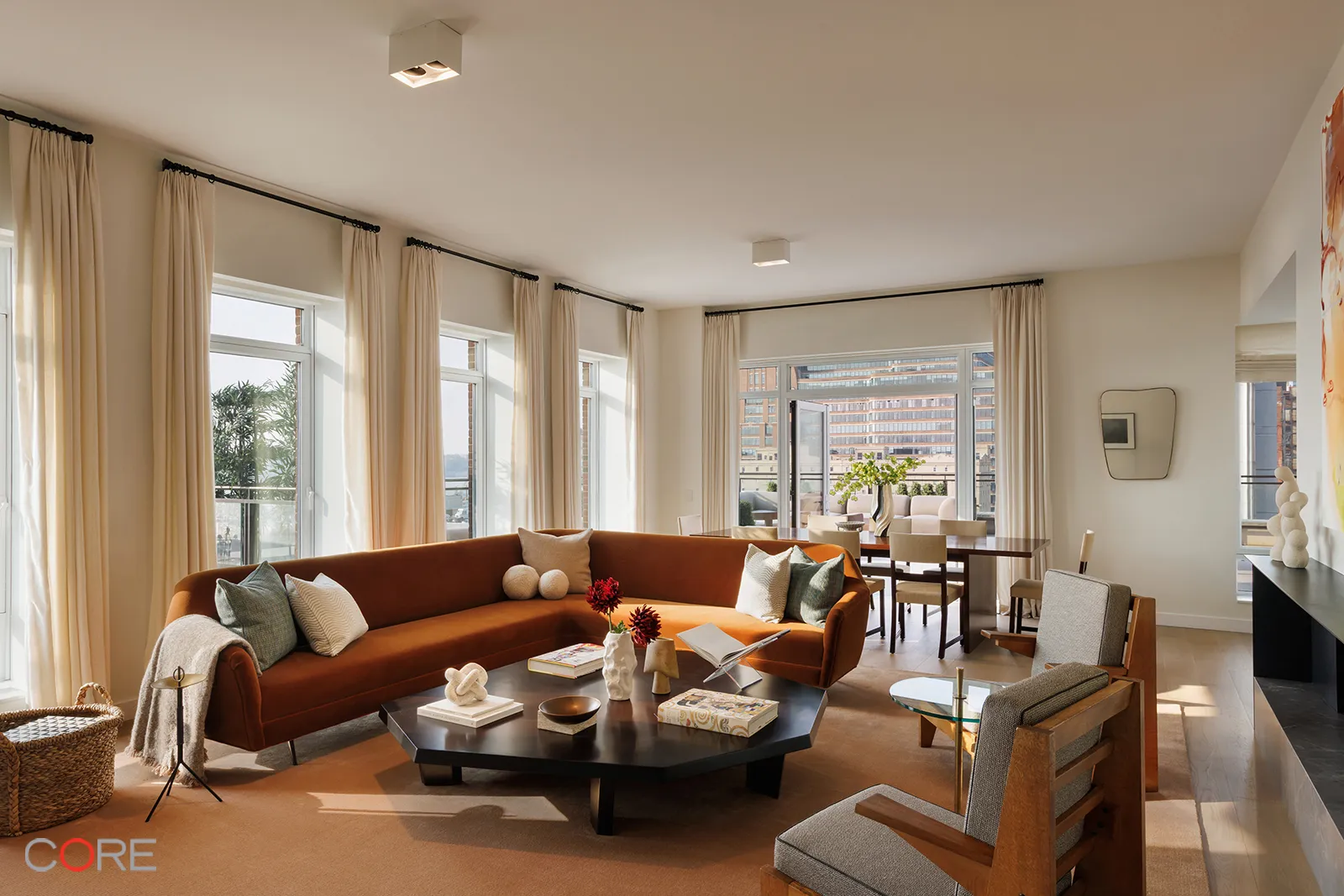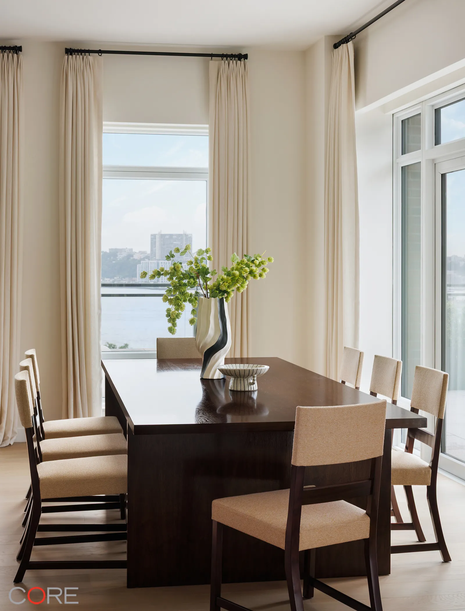 The expansive, open-plan living and dining areas feature unobstructed views of the Hudson River, a 29-foot corner great room, a windowed eat-in kitchen with a custom Olson Kundig-designed Jackbox, warm wood flooring, floor-to-ceiling windows, and bay windows. The primary bedroom suite offers a fireplace and double walk-in closets. The amenity program is the heart of the residential experience at 555 W 22nd St.