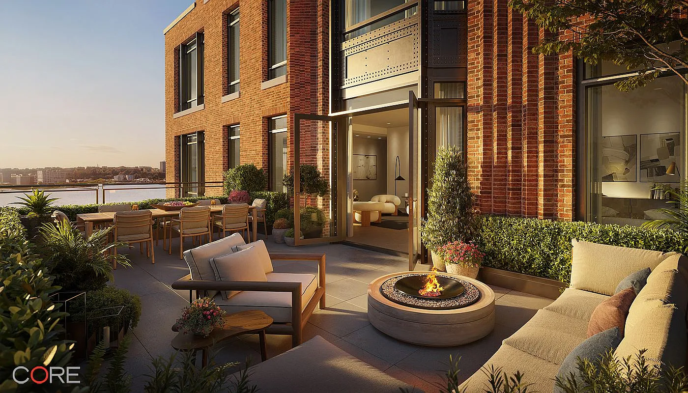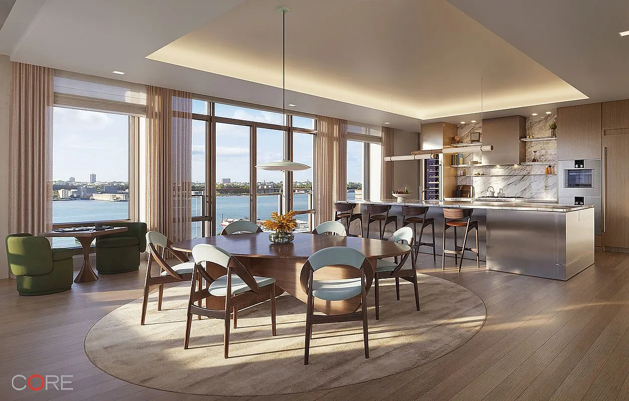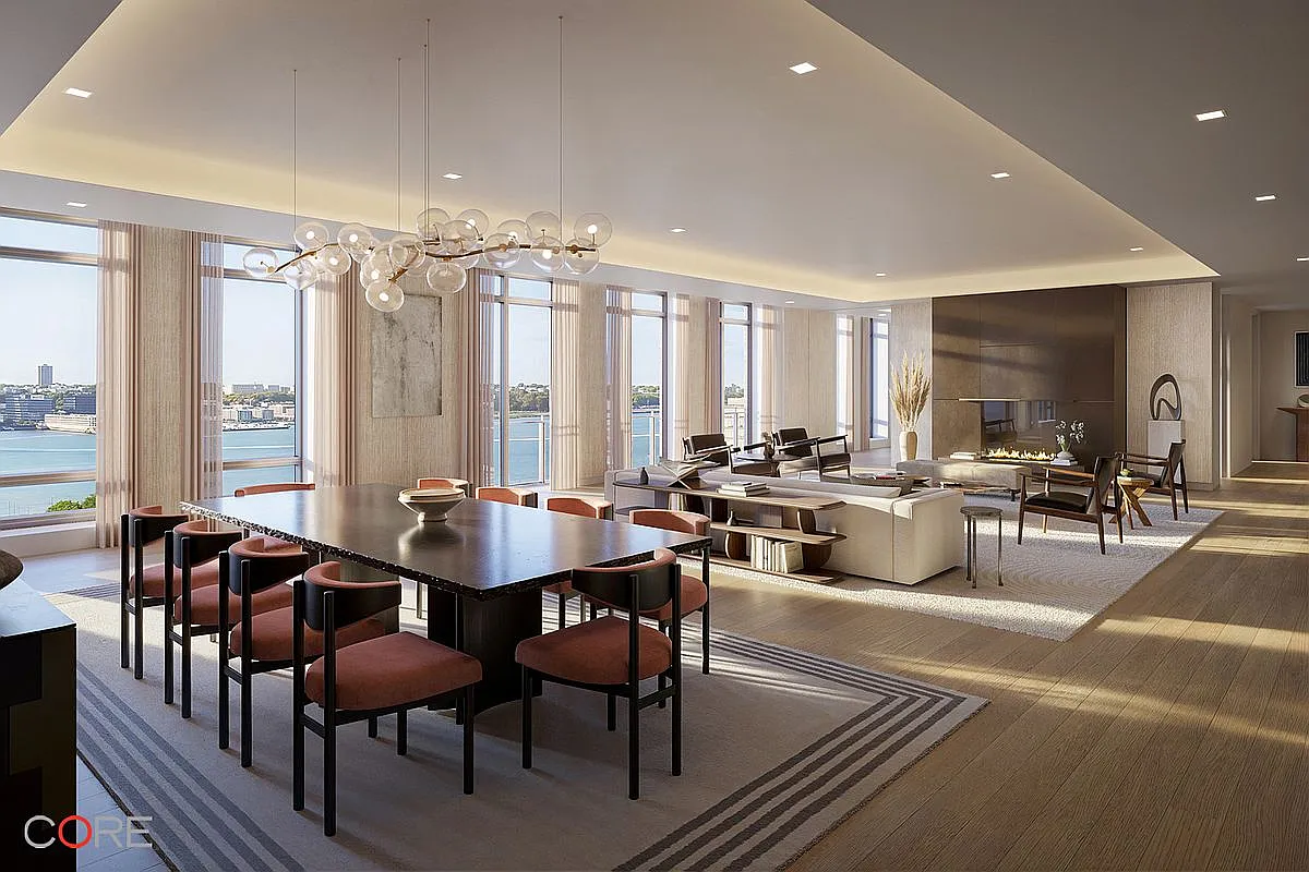 Residence Penthouse 23 is 6,267 square feet, featuring four bedrooms, four bathrooms, a powder room, and two private terraces totaling 1,357 square feet. The expansive, open-plan living and dining areas showcase sweeping views of the Hudson River and the New York City skyline through floor-to-ceiling windows, with north, south, east, and west exposures flooding the home with natural light. A statement fireplace and wet bar anchor the entertaining spaces, while the windowed eat-in kitchen, featuring a custom Olson Kundig–designed Jackbox, offers a warm, modern aesthetic with rich wood flooring throughout.