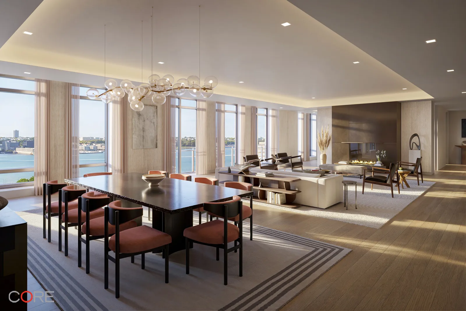 Residence PH23W is 6,267 square feet, featuring four bedrooms, four bathrooms, a powder room, and two private terraces totaling 1,357 square feet. The expansive, open-plan living and dining areas showcase sweeping views of the Hudson River and the New York City skyline through floor-to-ceiling windows, with north, south, east, and west exposures flooding the home with natural light. A statement fireplace and wet bar anchor the entertaining spaces, while the windowed eat-in kitchen, featuring a custom Olson Kundig–designed Jackbox, offers a warm, modern aesthetic with rich wood flooring throughout.