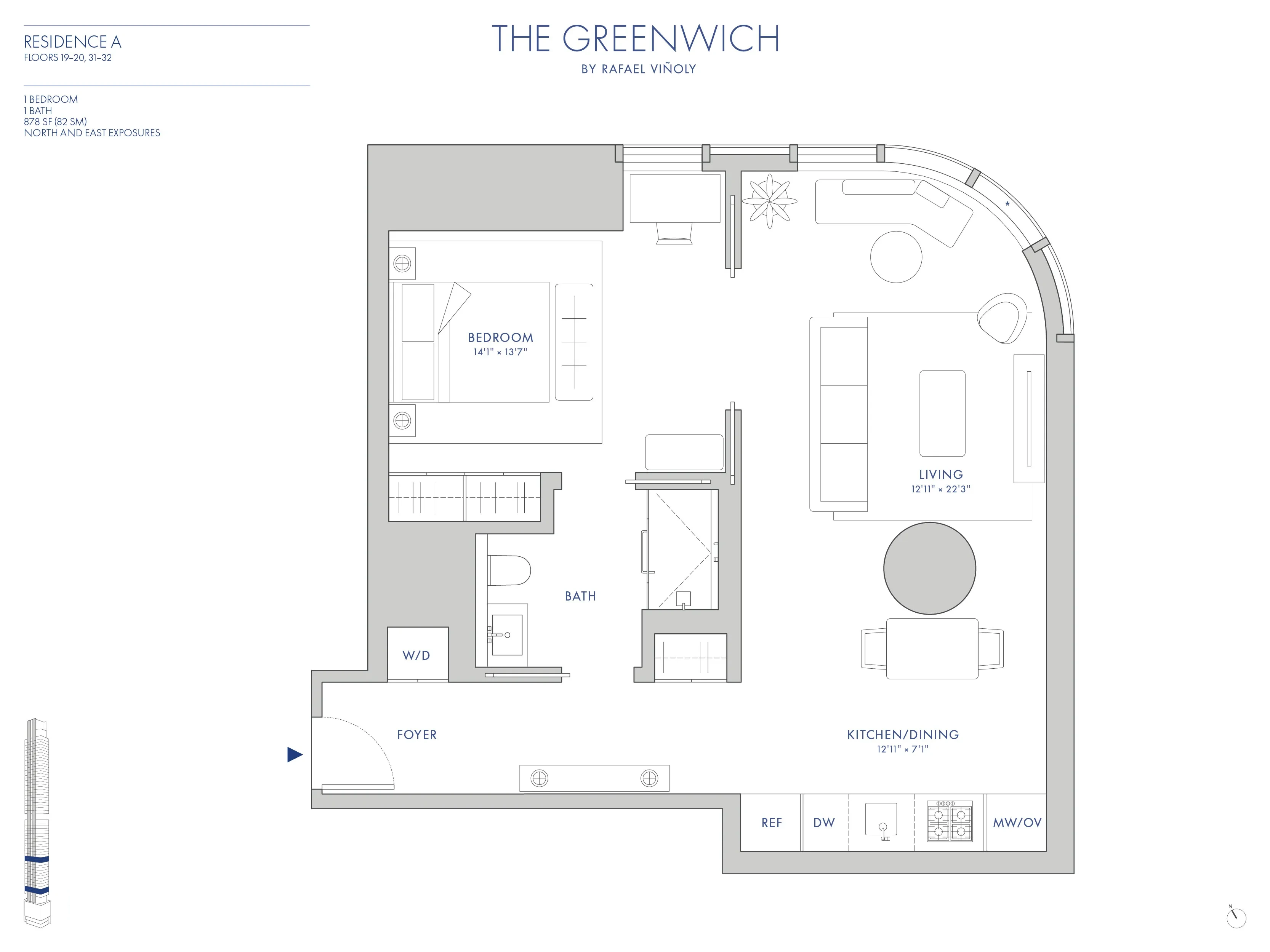 Immediate Occupancy Welcome to 32A at 125 Greenwich St by Rafael Vinoly, a one-bedroom residence with northern and eastern exposures. This home, at 878 square feet, is meticulously designed featuring a living room designed for hosting, large enough for dining and entertaining spaces to be separated. The formal entry opens to the generously sized living space with 6" wide white oak flooring in a dark brown finish.