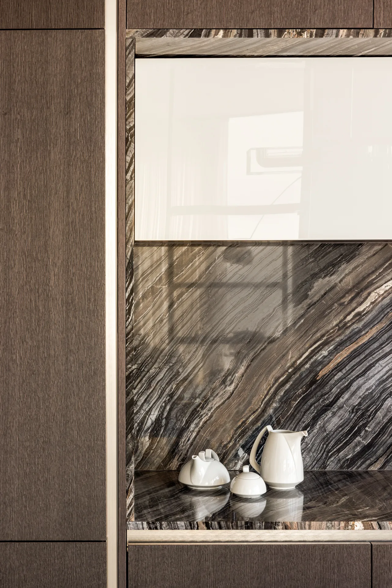 The custom designed kitchen features a full suite of Miele appliances, a vented hood, polished nickel fixtures, cabinets in walnut finish, and Ombra di Caravaggio marble countertops and backsplash. The oversized west facing primary bedroom features a wall of custom designed closets and custom designed primary bathroom featuring floor-to-ceiling Covelano marble, radiant heated floors, a custom wall-mounted vanity and faucet, and medicine cabinet with recessed lighting. A Miele washer and dryer and a climate control thermostat complete this home.