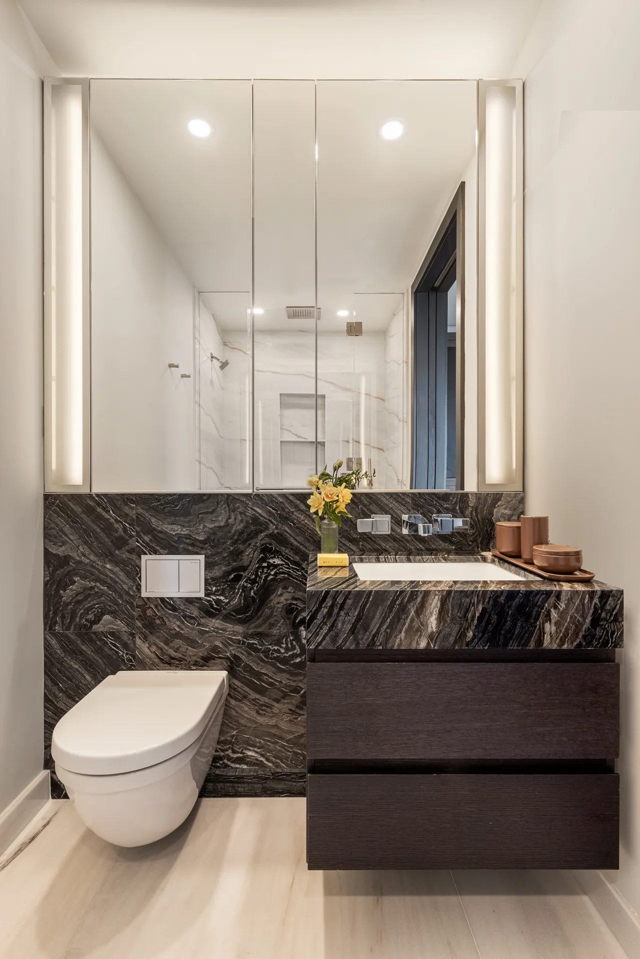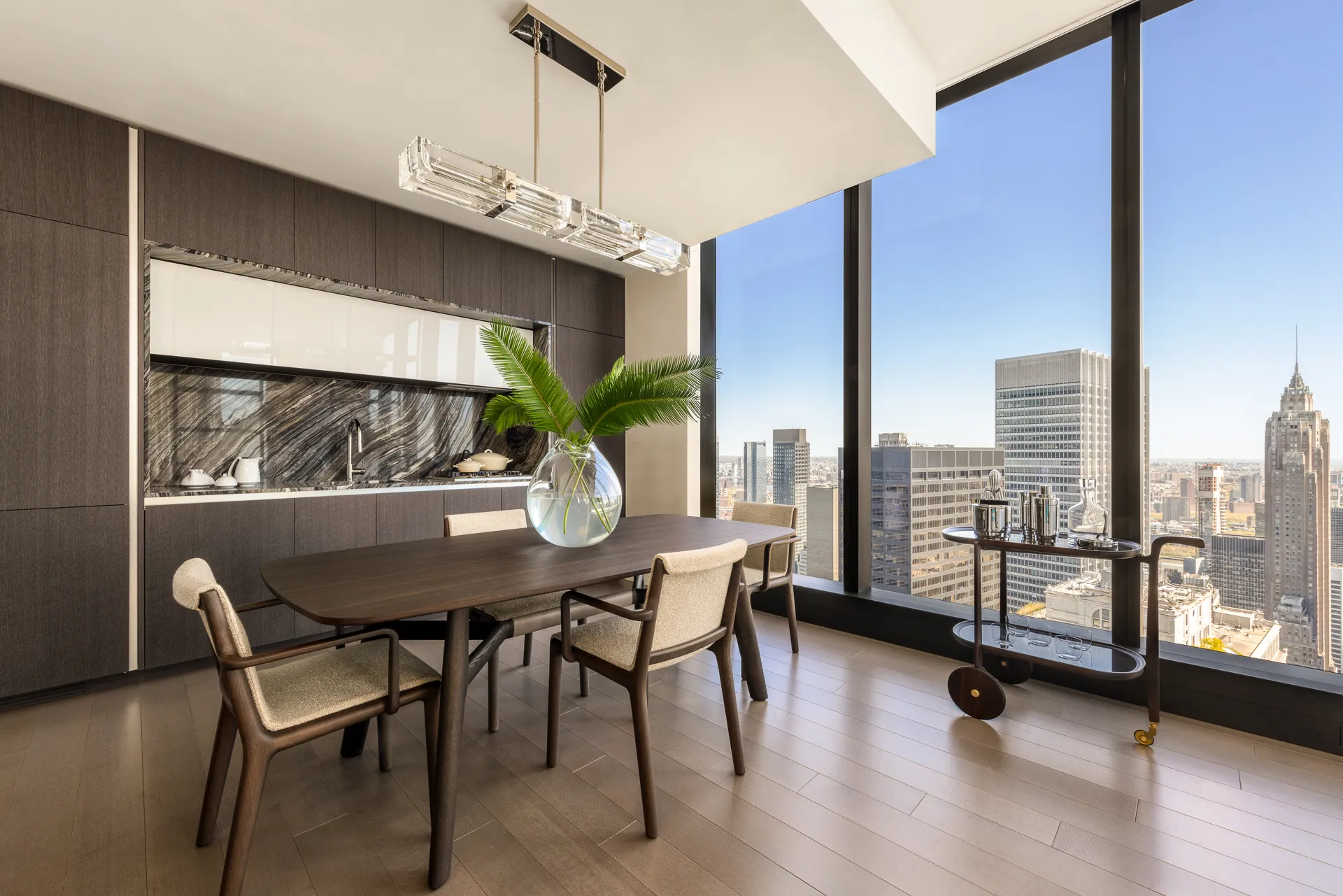 The custom designed kitchen features a full suite of Miele appliances, a vented hood, polished nickel fixtures, cabinets in walnut finish, and Ombra di Caravaggio marble countertops and backsplash. The custom design primary bathroom features floor-to-ceiling Covelano marble, radiant heated floors, a custom wall-mounted vanity and faucet, and medicine cabinet with recessed lighting. A Miele washer and dryer and a climate control thermostat completes this home.