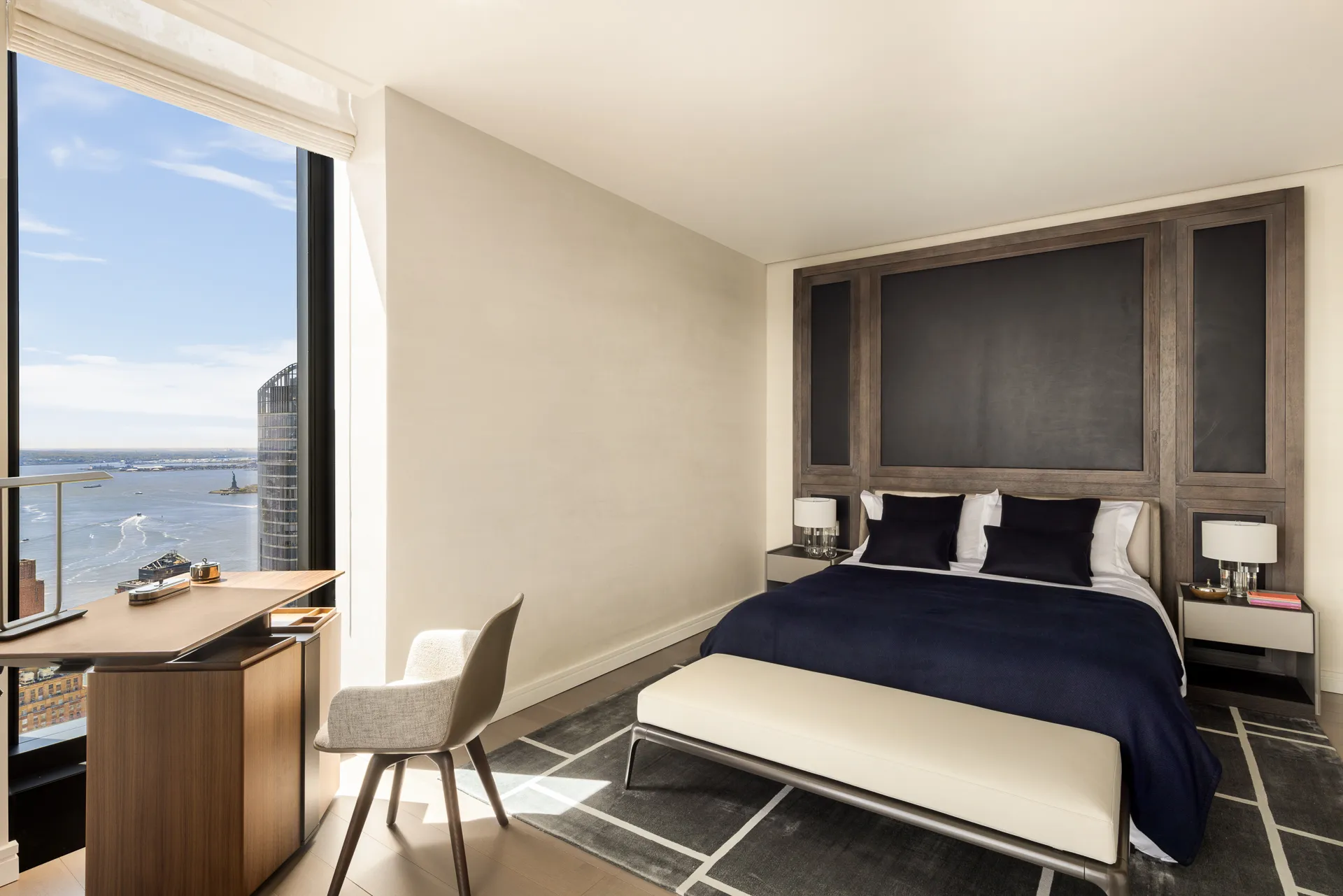 Residence 79B at 125 Greenwich St by Rafael Vinoly is a generously sized one-bedroom, one-and-a-half-bathroom home showcasing southern and eastern exposures, revealing panoramic vistas of the illustrious Manhattan Skyline, the East River, New York Harbor, and the Statue of Liberty. Indulge yourself in the breathtaking panoramas visible through floor-to-ceiling windows, adorned with ceiling heights reaching over 10 feet, presenting an ever-evolving canvas of the city skyline and waterfront. Spanning 957 square feet, this residence offers meticulously crafted living spaces, adorned with interior finishes by the esteemed design firm, MAWD. The formal entry foyer opens to the gracious living space, a powder room, and a well sized entertaining space with 6" wide white oak flooring in dark brown finish.