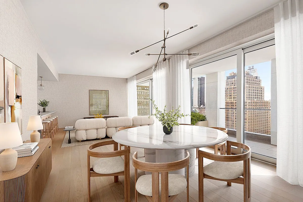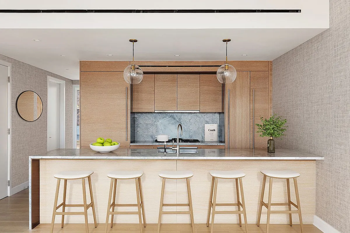 Upon entry, just beyond the initial walk-in closet, the sun-drenched living and dining areas unfold seamlessly onto the first private terrace, boasting over 48 feet of frontage along 28th Street. The exquisite chef’s kitchen is appointed with a fully integrated suite of Miele appliances, including a dishwasher and wine refrigerator. Custom white oak cabinetry by Scavolini envelops the space, accented with oil-rubbed bronze surrounds and under-cabinet lighting.