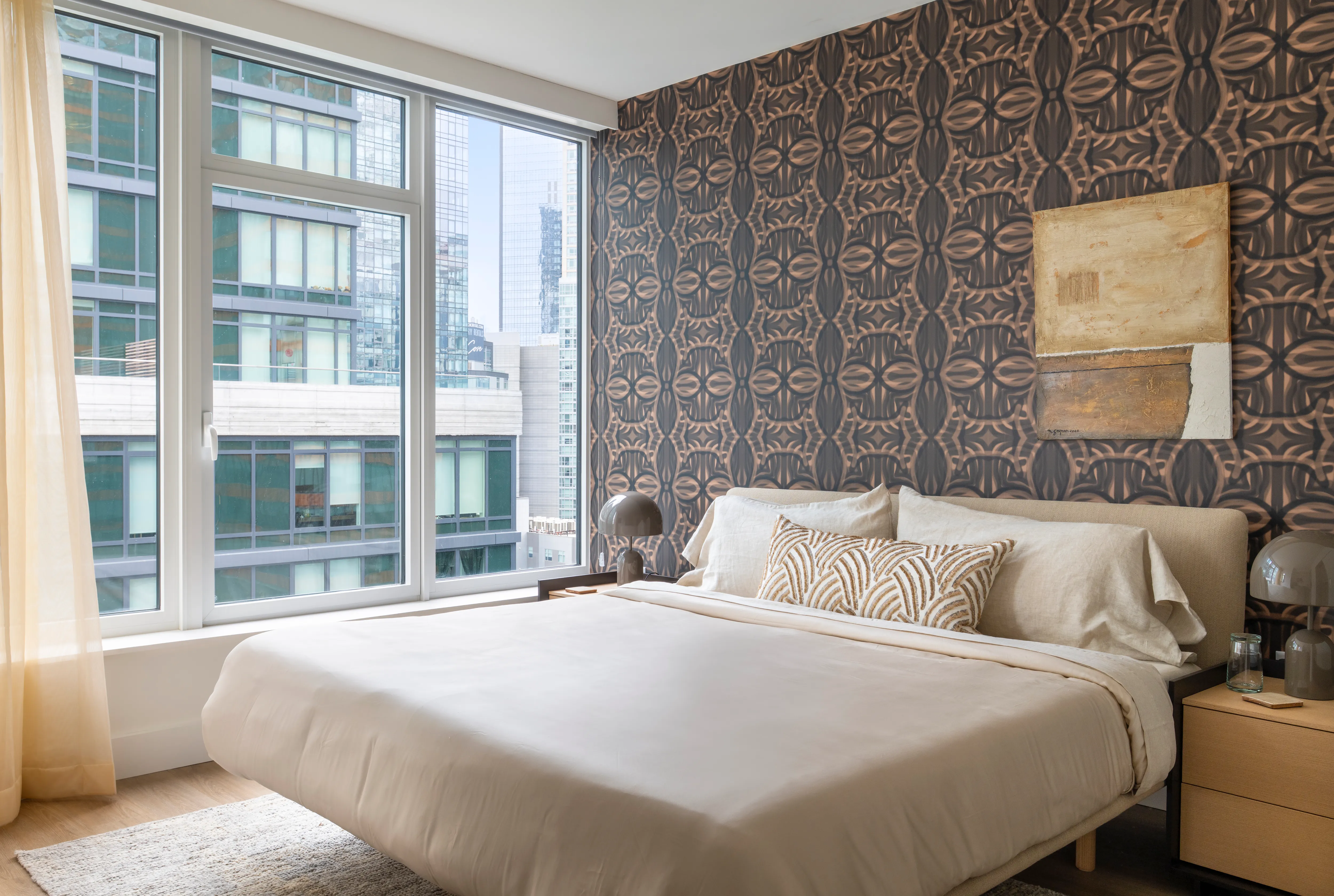 Welcome to 42-06 Orchard St, Residence 40N, a two-bedroom, one-bathroom home offering a sun-drenched, open layout framed by oversized windows, soaring ceilings with remarkable views. Enjoy a sleek kitchen with quartz countertops, two-tone cabinetry, and a Samsung stainless steel appliance suite, plus a spa-inspired bath with polished porcelain tile and chrome fixtures. Thoughtful touches like custom closets, solar shades, keyless entry, and in-unit washer and dryer make city living effortless.
