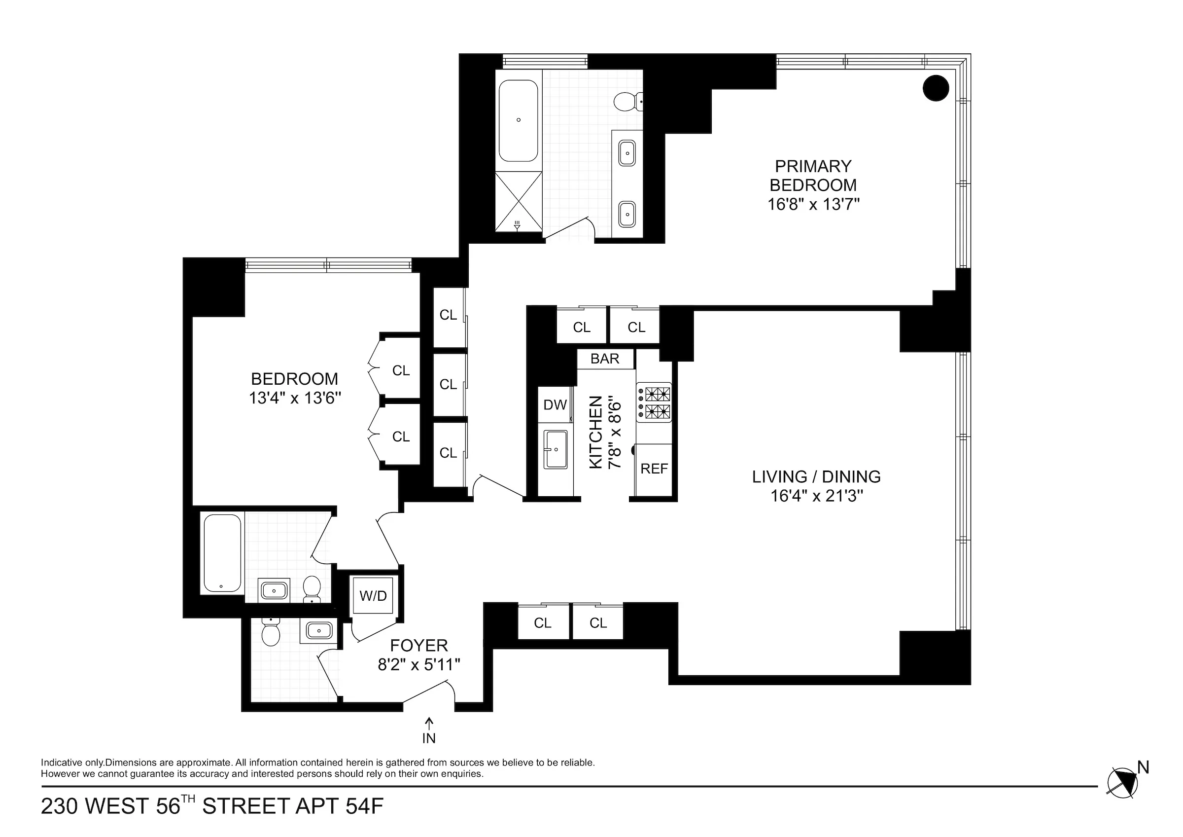 Conveniently, the washer/dryer is located within the home. This is a rare opportunity to own a sun-drenched corner residence with world-class views in one of the city's most sought-after locations. 230 W 56th St is a premier condominium that provides 24-hour doorman and concierge service, on-site parking, a fitness center, a business center, and a club room. The location is just minutes from Manhattan's finest shopping, dining, opera, theaters, and entertainment options.