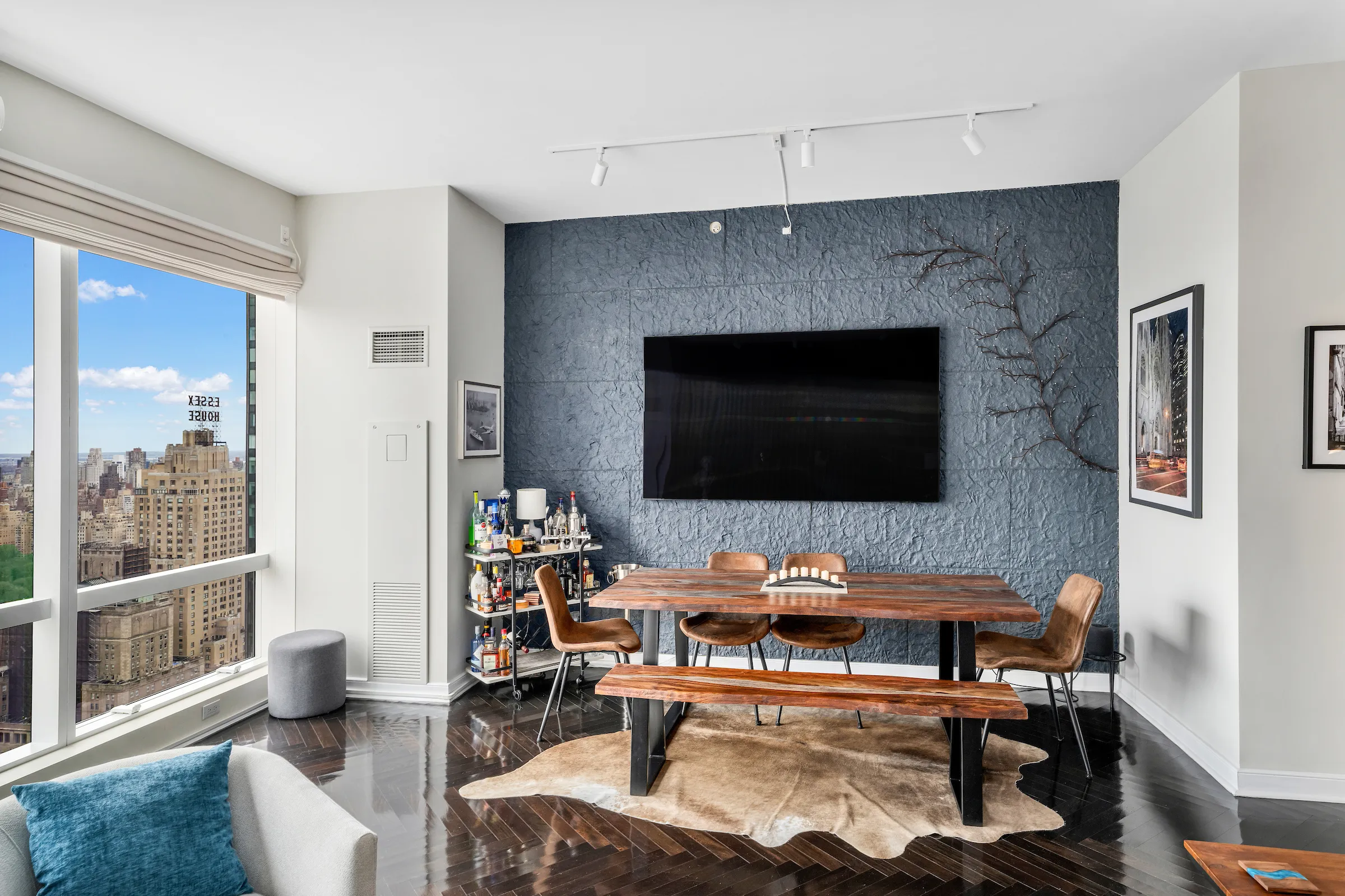 A wall of 10-foot floor-to-ceiling windows provides spectacular views of Central Park and beyond, making this residence perfect for entertaining. Adjacent to the spacious living area is the kitchen, equipped with top-of-the-line appliances and a blend of custom wood and stainless steel finishes. The kitchen has been expanded to offer ample cabinet and preparation space.